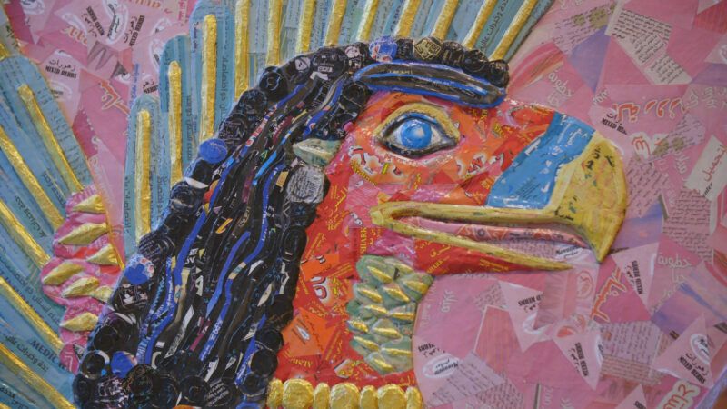 These reliefs themselves continue the material culture of the larger project, which is to use the packaging of Middle Eastern food stuffs and Arabic English newspapers that are found throughout the United States in different groceries, which are often gathering spaces for a lot of families who come from places like Palestine, Syria, Iraq. In those places, where they get the spices and different ingredients to continue to make their cuisine, they also get these Arabic English newspapers that are given away for free. And so that newspaper shows up in these reappearances as well. One of the things that’s interesting about the particular focus on the Northwest Palace of Nimrud is that it was built by an Assyrian King Ashurnasirpal the Second in the middle of the 800s BC. And the places in Chicago where I gather the materials from are operated mostly by immigrants from Northern Iraq, so they are the direct descendants of the people that made the original reliefs. And so there’s this nice circular economy, that the hands that made these in the first place are being resurrected in some ways, are being reanimated by the professions that their descendants have taken on in this new part of the world.