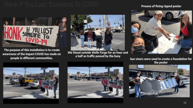 Student slides sharing their collaborative art-based actions that engage communities in high schools, colleges, and the community around the university: