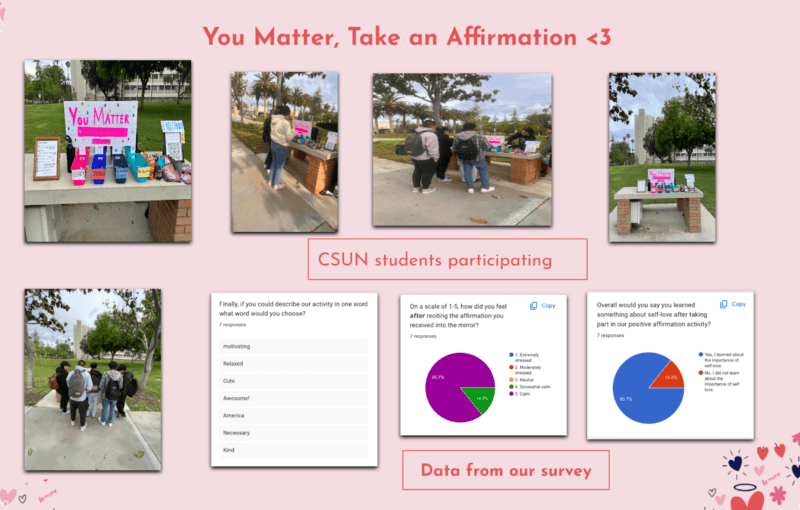 Students collected data on the value of their interactions (see example above) and shared their reflections in a”final paper. Leah B. shared, “I think we worked best on working with other students on campus and creating tha” safe space to”be vulnerable.” Stef shared, “as a School Climate Advocate, I am always trying to think of new and creative ways to build positive relationships with students while also supporting students in their social and emotional growth. This activity allowed for students to share their ideas with one another and maybe even lea”n of other self-care methods.” The projects led to some unexpected outcomes. As students set up their interventions in public spaces on the university campus, The Oasis (campus mental health center) invited groups to collaborate in future events to support wellness. The early impact of Aguiñiga and Brugera continues to demonstrate how art can engage communities at all levels. Their example has paved the way to create spaces for this ongoing and important work in the university and elementary classrooms.