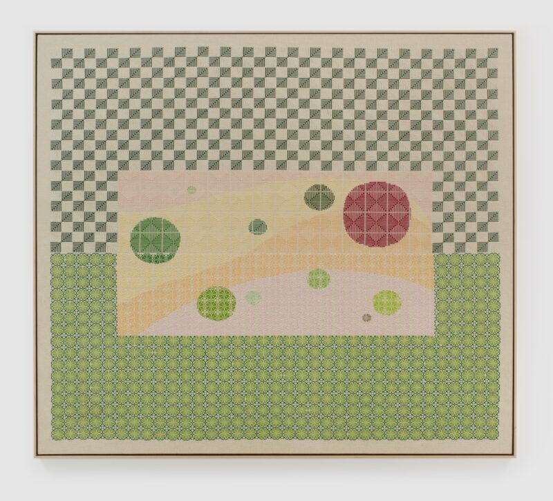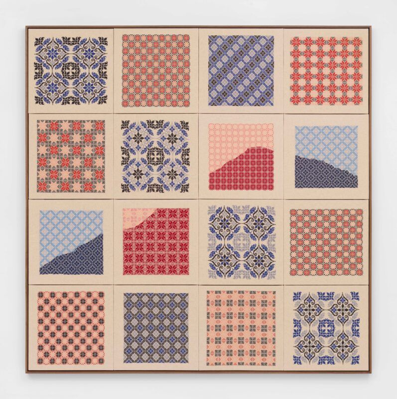 When I started working with Palestinian embroidery, I was very focused on the fact that each symbol has a history in a specific place. By looking at a woman’s dress, you could know which village she’s from. I was focusing on the language encapsulated in these traditional patterns and was fixated on the fact that I was not from there. I had moved back to New York where I am from, so in the first works I made, I started inventing a vocabulary of patterns that would be for a Palestinian from New York to use. All the patterns used in Palestine are based on different flora and fauna and geographical features from Palestine. I looked around my Upper West Side neighborhood and made symbols that were based on my surroundings. I was making compositions that mirrored Palestinian embroidery compositions but using my own symbols for New York.