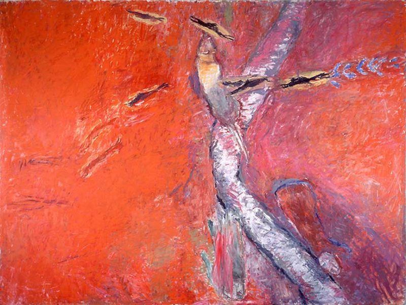 My walks and the geography here inform my angle of vision—the creek bed, the arroyos. Some times, while walking in the creek, I can’t see the tower of power clouds because the cliffs cut them off, and other times I’m on the top walking along and looking down into these bays and meadows that have resulted through erosion of the creek bed. It inspired a whole series of other paintings where I deliberately used different perspectives. Mysteriously, there was a dead cow in the creek once, which I saw from about forty feet above—which became the painting Galisteo Creek. So I’ve taken what I learned from being outside and brought it into the interior scenes of my life. I want to have a sense of where I’ll be going, but not know what the image will be. Where you start is the biggest problem.