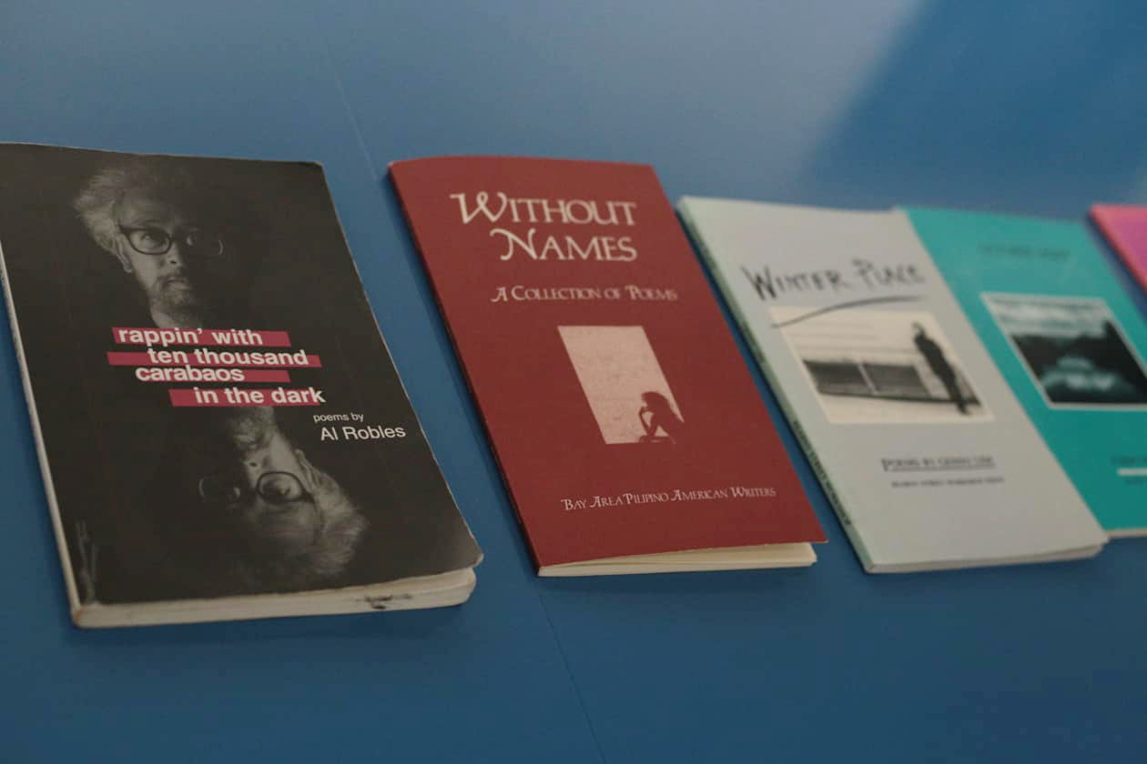 Installation view of Pilipinx American Library, Asian Art Museum, 2018. Al Robles, Rappin’ ​With Ten Thousand Carabaos in the Dark: Poems, 1996. Kearny Street Workshop publications: ​Without Names,​ (1985), ​Winter Place​ (1989), ​October Light (1987). Photo: Anthony Bongco.