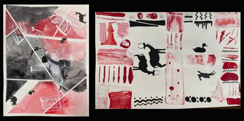 Middle School student artwork, three variations inspired by Helen Frankenthaler & Walton Ford. Courtesy of Gregg Emery.