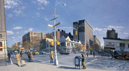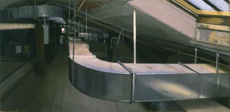 Rackstraw Downes was born in Kent, England in 1939. Often described as a realist painter, Downes prefers not to use that term. He views the act of seeing and the art of representation as culturally taught, with different cultures accepting different delineations of the world as realistic. He does not think of himself as a landscape painter, but as a painter of his surroundings—his environment. Often painted in a panoramic format, Downes’s images evince careful attention to details as well as to broad expanses of their surroundings.