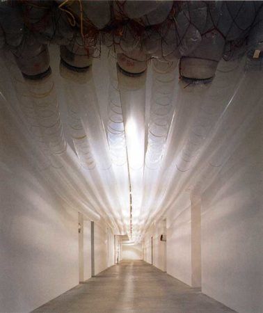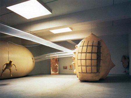 Tim Hawkinson was born in San Francisco, California, in 1960. A graduate of San Jose State University, he later earned his MFA at the University of California, Los Angeles, in 1989. Hawkinson is renowned for creating complex sculptural systems through surprisingly simple means. His installation, Überorgan—a stadium-size, fully automated bagpipe—was pieced together from bits of electrical hardware and several miles of inflated plastic sheeting.