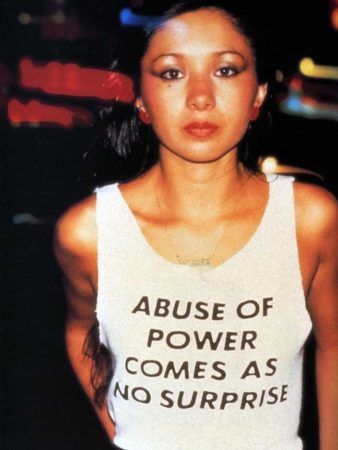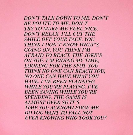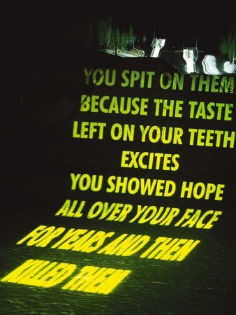 While her subversive work often blends in among advertisements in public space, its arresting content violates expectations. Holzer’s texts—such as the aphorisms “Abuse of power comes as no surprise” and “Protect me from what I want”—have appeared on posters and condoms, and as electronic LED signs and projections of xenon light. Holzer’s recent use of text ranges from silk-screened paintings of declassified government memoranda detailing prisoner abuse to poetry and prose in a sixty-five-foot-wide wall of light in the lobby of 7 World Trade Center, New York.
