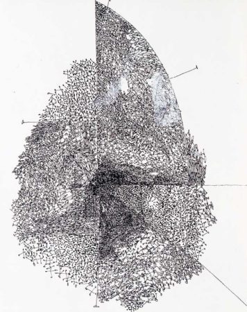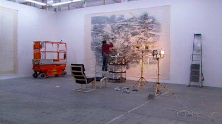 Mehretu’s paintings and drawings refer to elements of mapping and architecture, achieving a calligraphic complexity that resembles turbulent atmospheres and dense social networks. Architectural renderings and aerial views of urban grids enter the work as fragments, losing their real-world specificity and challenging narrow geographic and cultural readings. The paintings’ wax-like surfaces—built up over weeks and months in thin translucent layers—have a luminous warmth and spatial depth. Their formal qualities of light and space are made all the more complex by Mehretu’s delicate depictions of fire, explosions, and perspectives in both two and three dimensions. Her works engage the history of nonobjective art—from Constructivism to Futurism—posing contemporary questions about the relationship between utopian impulses and abstraction.