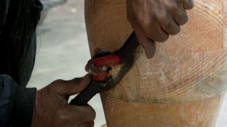 In Ladder for Booker T. Washington, Puryear built a spindly, meandering ladder out of jointed ash wood. More than thirty-five-feet tall, the ladder narrows toward the top, creating a distorted sense of perspective that evokes an unattainable or illusionary goal. In the massive stone piece, Untitled, Puryear enlisted a local stonemason to help him construct a building-like structure on a ranch in northern California. On one side of the work is an eighteen-foot-high wall—on the other side, an inexplicable stone bulge. A favorite form that occurs in Puryear’s work, the thick-looking stone bulge is surprisingly hollow, coloring the otherwise sturdy shape with qualities of uncertainty, emptiness, and loss.