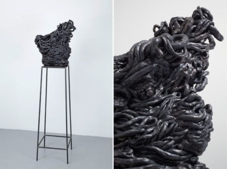 By incorporating casts of firebricks and porcelain slip molds into her sculptures (revealing the tools of industry), she reflects on and investigates the tradition of decorative arts. Variously sensual, humorous, and elegant, her clay-based vessels evoke the tension between control and chaos, beauty and ugliness, perfection and imperfection. Considering herself an installation artist who happens to make objects, Shechet focuses intently on ensuring that the display, sight lines, and relationships of the objects in her exhibitions change with every view while maintaining formal equilibrium.