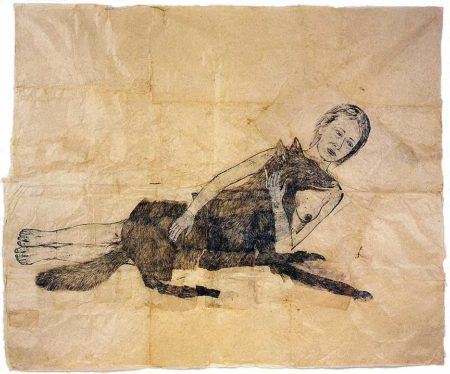 In the 1980s, Smith literally turned the figurative tradition in sculpture inside out, creating objects and drawings based on organs, cellular forms, and the human nervous system. This body of work evolved to incorporate animals, domestic objects, and narrative tropes from classical mythology and folk tales. Life, death, and resurrection are thematic signposts in many of Smith’s installations and sculptures. In several of her pieces, including Lying with the Wolf, Wearing the Skin, and Rapture, Smith takes as her inspiration the life of St. Genevieve, the patron saint of Paris. Portrayed communing with a wolf, taking shelter with its pelt, and being born from its womb, Smith’s character of Genevieve embodies the complex, symbolic relationships between humans and animals.