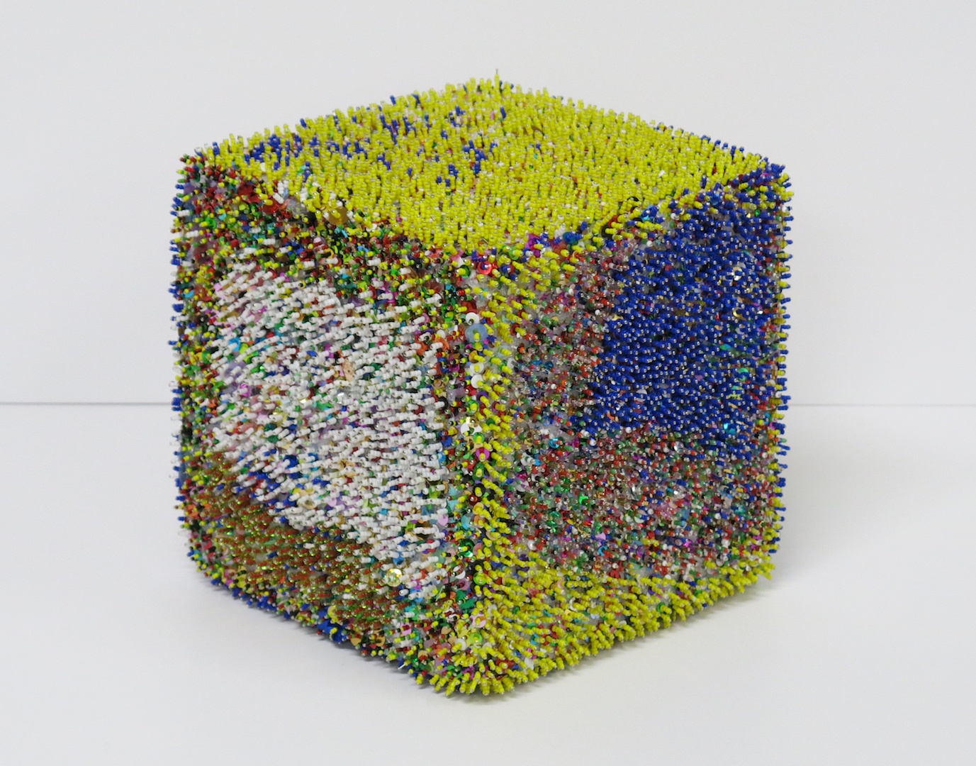 Monica Valentine was born in San Mateo, California, in 1955. Using pins, colored sequins, beads and shaped foam, Valentine creates sculptures that are both visually rich and tactile. From geometric cubes and spheres to more playful cake shapes, skulls and logs, Valentine’s sculptures draw up the artist’s fascination with color, despite her blindness.