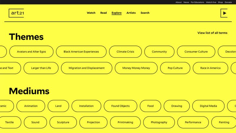 The launch of the new Explore area of Art21.org gathers the threads that connect artists’ stories as documented through over 20 years of Art21 films. Like a series of curated screening rooms, each Explore collection brings together programming aligned by a common theme, medium, or narrative.