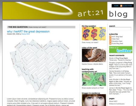Art21 launches the Art21 Blog with one of the earliest guest blogging programs online. The Art21 Blog would feature some of today’s foremost contemporary art writers and critics, such as art historian Ben Street, Sharon Butler (Two Coats of Paint), and Hrag Vartanian (Hyperallergic).