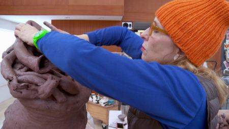 • Arlene Shechet wearing blue gloves holding a squeeze bottle above a sculpture.