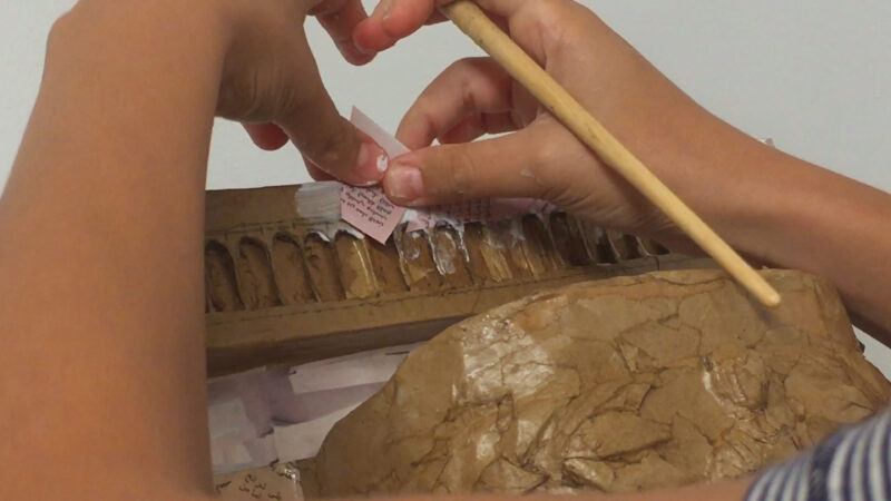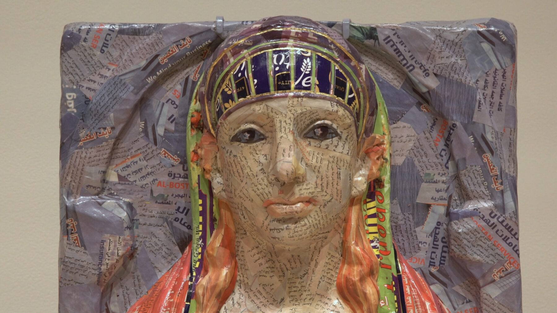 These reliefs themselves continue the material culture of the larger project, which is to use the packaging of Middle Eastern food stuffs and Arabic English newspapers that are found throughout the United States in different groceries, which are often gathering spaces for a lot of families who come from places like Palestine, Syria, Iraq. In those places, where they get the spices and different ingredients to continue to make their cuisine, they also get these Arabic English newspapers that are given away for free. And so that newspaper shows up in these reappearances as well. One of the things that’s interesting about the particular focus on the Northwest Palace of Nimrud is that it was built by an Assyrian King Ashurnasirpal the Second in the middle of the 800s BC. And the places in Chicago where I gather the materials from are operated mostly by immigrants from Northern Iraq, so they are the direct descendants of the people that made the original reliefs. And so there’s this nice circular economy, that the hands that made these in the first place are being resurrected in some ways, are being reanimated by the professions that their descendants have taken on in this new part of the world.