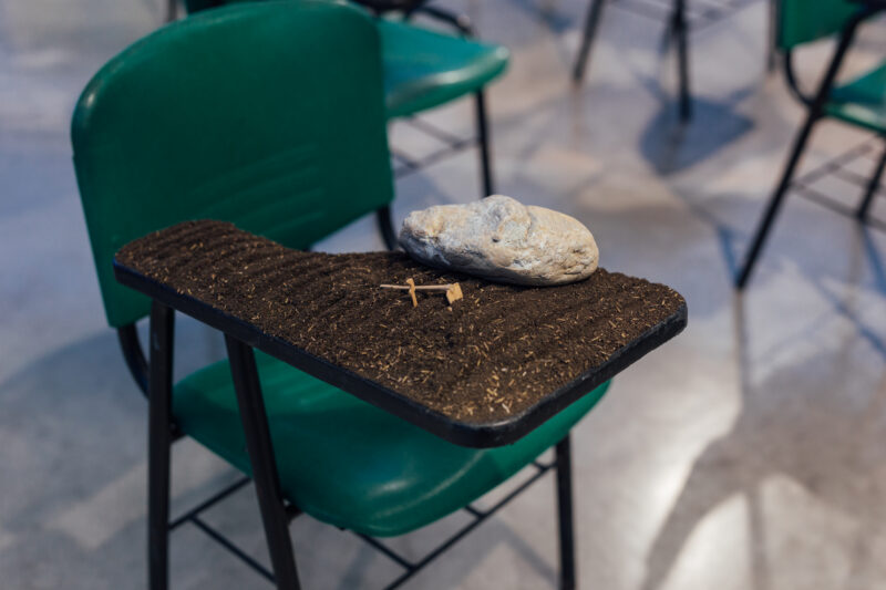 Me invitaron a una exposición en Colombia, en el Museo de Arte Moderno en Medellín. Propuse construir una especie de escuela. En la mesa de los niños solo habría tierra, piedras y un pequeño azadón, elementos que ya conocemos, pero que también desconocemos. Hice unos bordados como fondo. Hablé con los curadores y curadoras y les dije que también me gustaría que hiciéramos una siembra fuera del museo, para que algunas obras no entren al museo, sino que lo trabajen otras personas que no son considerados artistas o buscan la proyección de un artista.