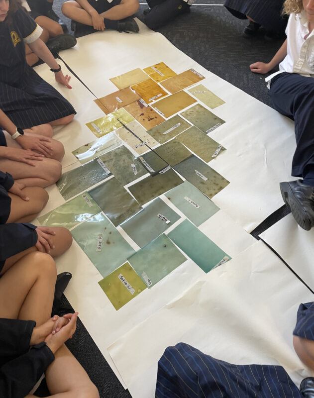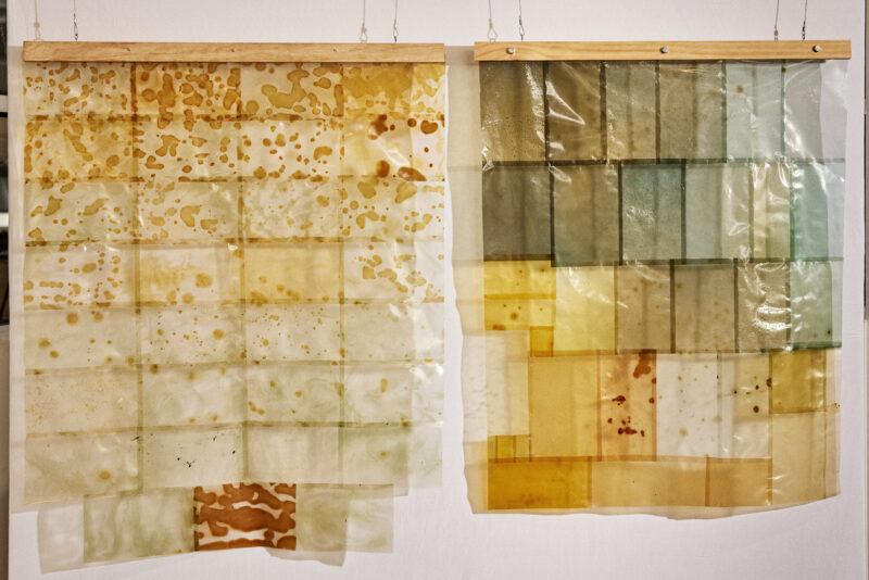 Over the course of Bio-studio, the students took heed of Mattingly’s and French’s practice and made a collaborative artwork using the bioplastics they had produced. The artwork used sustainable and renewable agar, glycerin (a biodegradable substance), and water. The bioplastic was coloured using locally sourced natural materials where possible. Students spoke of the Bio-studio program as an opportunity to learn more about the materials in our class–“I was able to explore the idea of sustainability further, as there is so little that we actually know works, but there’s so much more to experiment with.”  Next semester, this artwork and the offcuts will be melted back down and there will be another iteration of learning with another group of students. Nothing will go to the landfill.