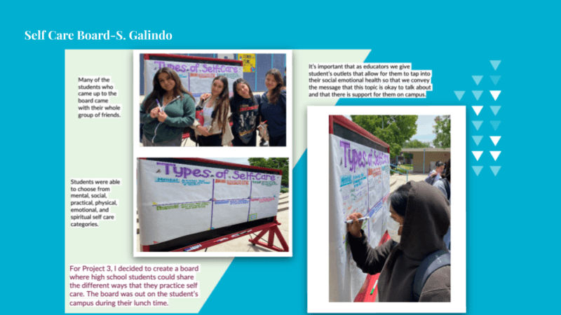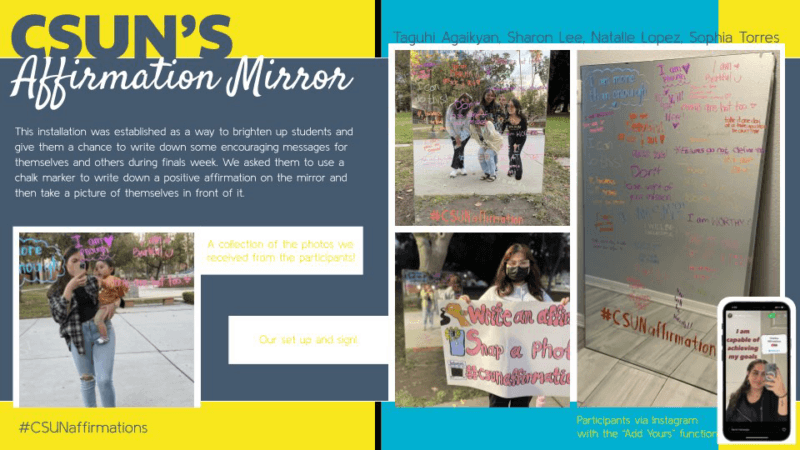 Students collected data on the value of their interactions (see example above) and shared their reflections in a”final paper. Leah B. shared, “I think we worked best on working with other students on campus and creating tha” safe space to”be vulnerable.” Stef shared, “as a School Climate Advocate, I am always trying to think of new and creative ways to build positive relationships with students while also supporting students in their social and emotional growth. This activity allowed for students to share their ideas with one another and maybe even lea”n of other self-care methods.” The projects led to some unexpected outcomes. As students set up their interventions in public spaces on the university campus, The Oasis (campus mental health center) invited groups to collaborate in future events to support wellness. The early impact of Aguiñiga and Brugera continues to demonstrate how art can engage communities at all levels. Their example has paved the way to create spaces for this ongoing and important work in the university and elementary classrooms.