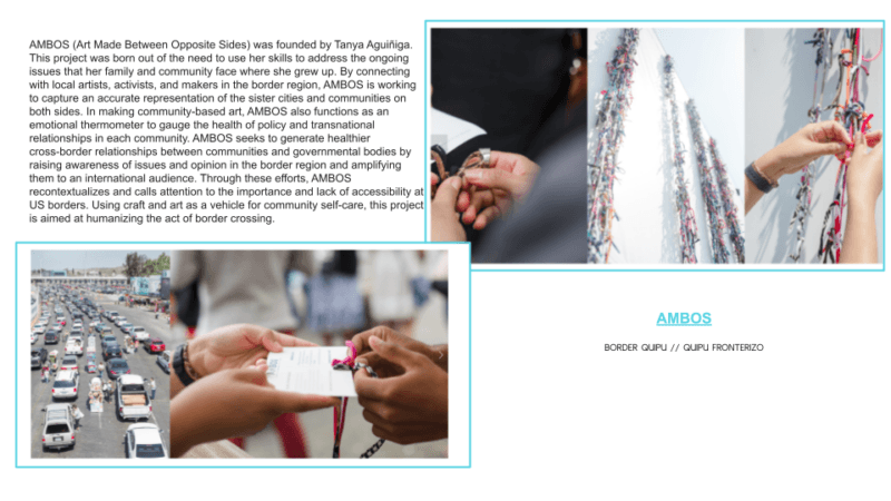 We examine Tanya Aguiñiga’s collaborative project, AMBOS, as a strategy for engaging communities across nations. She has a talent for weaving together stories that are carried out by many volunteers through small collaborative acts, and in turn impact the lives of many. This approach is something we can learn from. My students find her work particularly poignant, as it speaks to many of their lived experiences in entering the United States or in trying to connect with family across the border. Her segment in the Art in the Twenty-First Century episode, “Borderlands,” is emotionally charged; she demonstrates how art connects people, and how small actions like the braiding of the Quipo are a visual representation of connections across barriers. This work helps visualize how personal experiences can be translated into work that leads to social change. Small actions lead to bigger changes. This is something students see and can apply to the spaces that they work in.