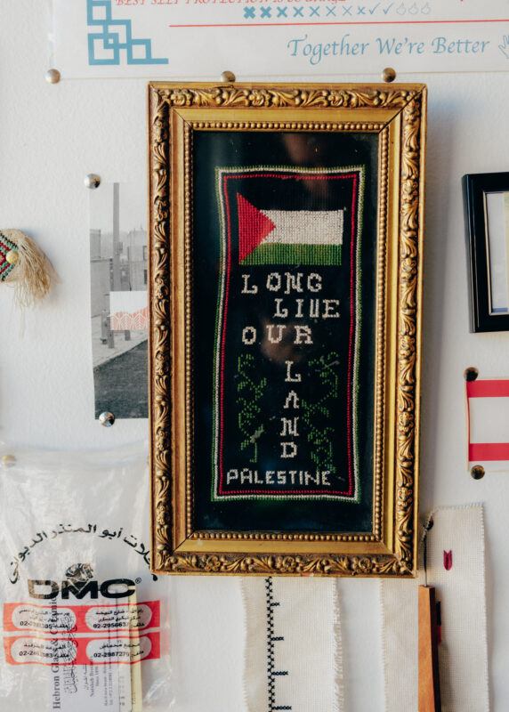 My work being Palestinian embroidery is connected to the fact that when I started making work, I was dating someone Israeli who is now my husband, and I started to go to Israel with him. I had been to Palestine when I was a teenager but hadn’t gone back as an adult. The entire topic was very stressful for me growing up in a Palestinian-American household in New York, where my surroundings were pro-Israel, but my dad was pro-Palestine. We’re Palestinian, and my dad was a doctor who had worked in Palestine. As a kid, I thought his perspective was very extreme but as an adult, I realized that he saw a lot with his own eyes and was trying to help people, but the way that he spoke about it sounded extreme when you’re inundated by pro-Israel views.