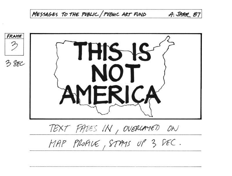 Alfredo Jaar, “A Logo for America,” 1987. Spectacolor animation, Times Square, New York, 1987. Presented as part of Public Art Fund’s exhibition series “Messages to the Public.” Courtesy Jane Dickson and Public Art Fund, New York.
