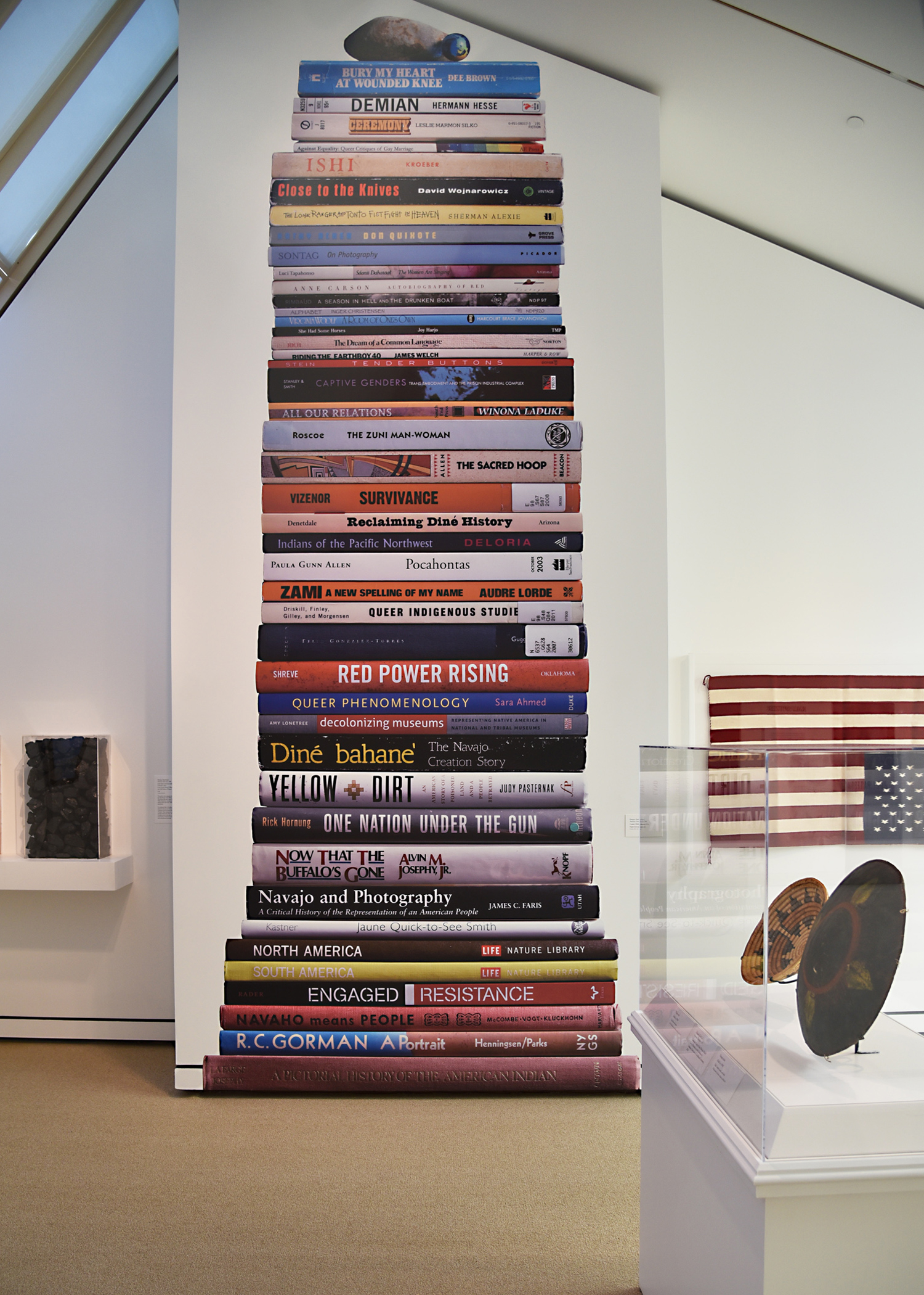 Installation view of Demian DinéYazhi, ​Untitled (Radical Indigenous Queer Feminist Bibliography)​, 2016. Mural is a part of Dene bāhī Naabaahii exhibition at the Center for Contemporary Native Art, Portland Art Museum. Photo: Demian DinéYazhi.