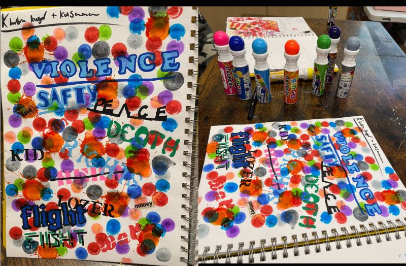 While watching Art21’s Extended Play film featuring Barbara Kruger, students were asked to write down at least 5 words or phrases that caught their attention. We then watched a trailer for the biopic on Yayoi Kusama, Kusama: Infinity, and used bingo daubers to create these pieces. Courtesy of Gregg Emery.