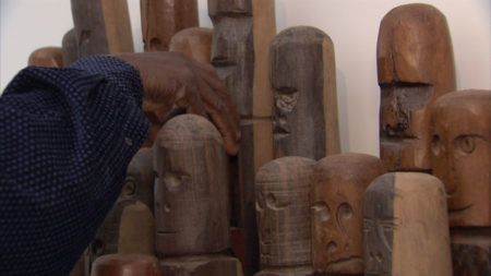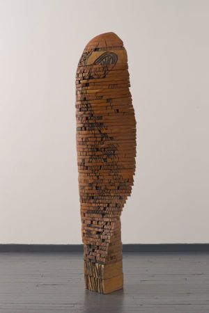 The colorful and densely patterned fields of the works assembled from discarded liquor-bottle caps also trace a broader story of colonial and postcolonial economic and cultural exchange in Africa, told in the history of cast-off materials. The sculptures in wood and ceramics introduce ideas about the function of objects (their destruction, transformation, and regeneration) in everyday life, and the role of language in deciphering visual symbols.