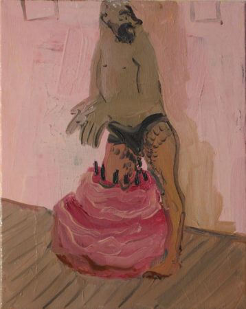 Tala Madani was born in Tehran, Iran in 1981. She skewers stereotypes in her sharply satirical paintings that evoke clashes of culture: men and women, the rational and the absurd, Western and non-Western. Madani’s figurative paintings often feature a riotous cast of middle-aged men, balding and stocky, whose libidinal mayhem wreaks havoc on any situation the artist thrusts them into. Acerbic caricatures of both machismo and a childlike desire for mischief, the physical comedy at work in Madani’s paintings is anchored by intense pleasures, pathos, and a pervasive sense of violence.