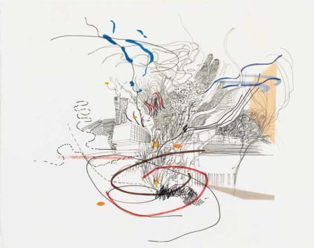 Mehretu’s paintings and drawings refer to elements of mapping and architecture, achieving a calligraphic complexity that resembles turbulent atmospheres and dense social networks. Architectural renderings and aerial views of urban grids enter the work as fragments, losing their real-world specificity and challenging narrow geographic and cultural readings. The paintings’ wax-like surfaces—built up over weeks and months in thin translucent layers—have a luminous warmth and spatial depth. Their formal qualities of light and space are made all the more complex by Mehretu’s delicate depictions of fire, explosions, and perspectives in both two and three dimensions. Her works engage the history of nonobjective art—from Constructivism to Futurism—posing contemporary questions about the relationship between utopian impulses and abstraction.