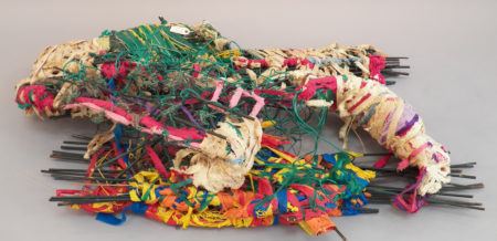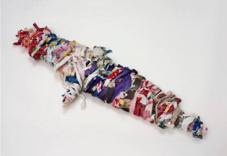 Judith Scott was born in Columbus, Ohio, in 1943. Isolated as a result of being institutionalized for most of her life due to Down syndrome and deafness, Scott began creating art at age forty-three, after being introduced to Creative Growth in 1987. Fabric quickly became her passion and medium of choice, and for the next eighteen years of her life, Scott created sculptures using yarn, twine, and strips of fabric, to wrap and knot around an array of mundane objects she discovered around her, such as keys, plastic tubing, bicycle wheels, and a shopping cart.