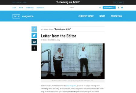 The Art21 Magazine launches its first issue, “Becoming an Artist,” completing the transformation from the Art21 Blog. From 2013 to today, the Art21 Magazine has published regular thematic issues of insightful writing on contemporary art.