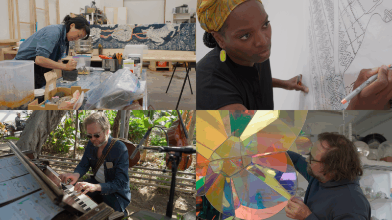 Production stills featuring Candice Lin, Njideka Akunyili Crosby, Ragnar Kjartansson, and Tomás Saraceno