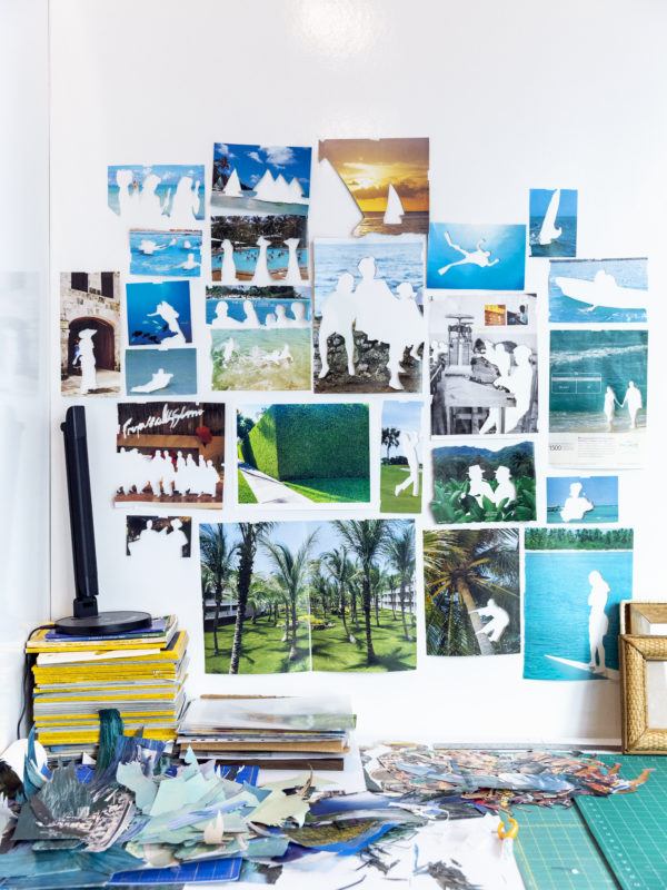 Joiri Minaya leaning over a table with a cutting board, holding an exacto knife to cut out an image of a woman in a bathing suit from a magazine.