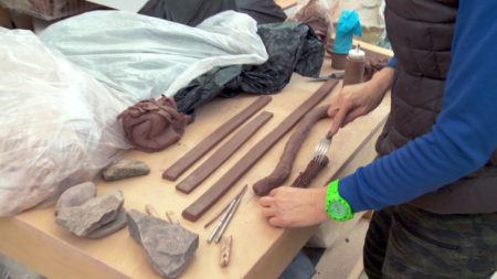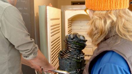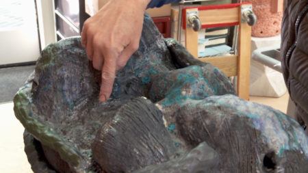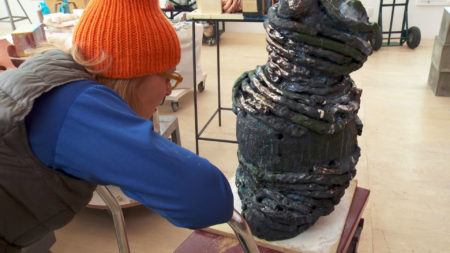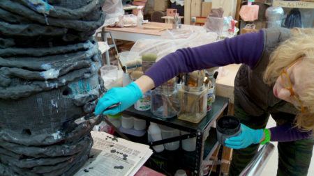 • Arlene Shechet wearing blue gloves holding a squeeze bottle above a sculpture.