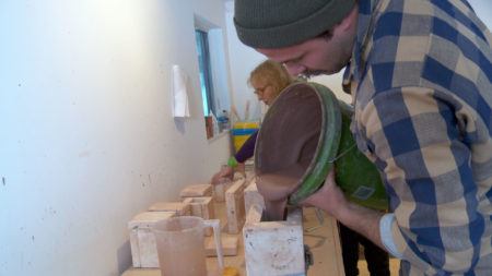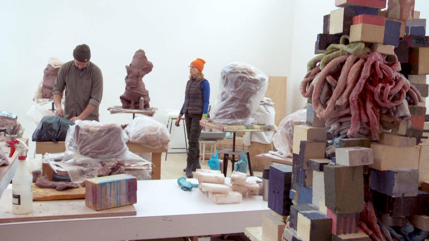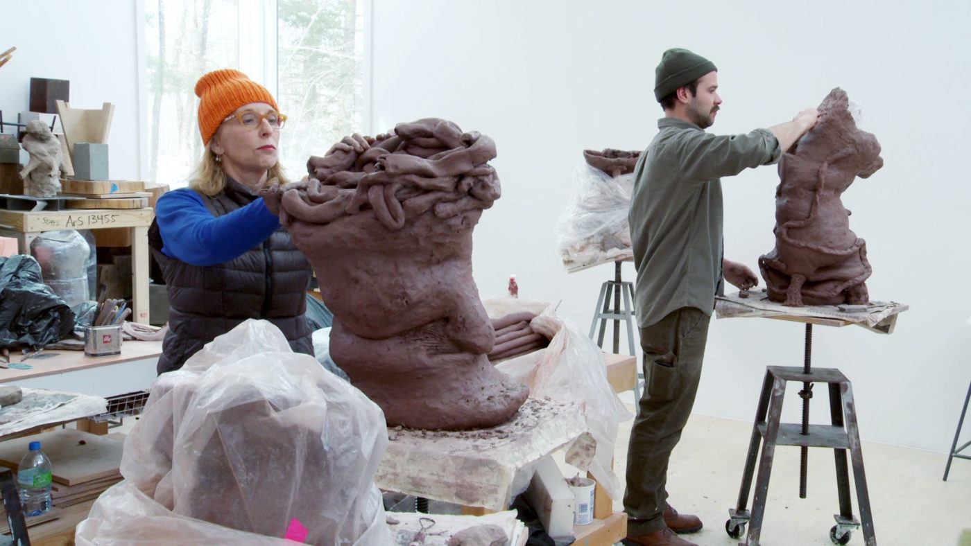 • Arlene Shechet with studio assistant Andrew Molleur at the artist's studio, Woodstock, NY